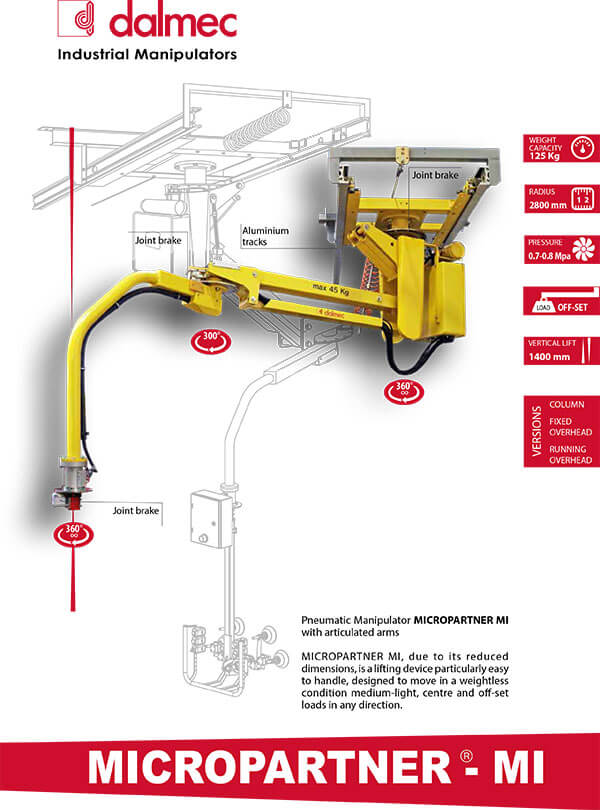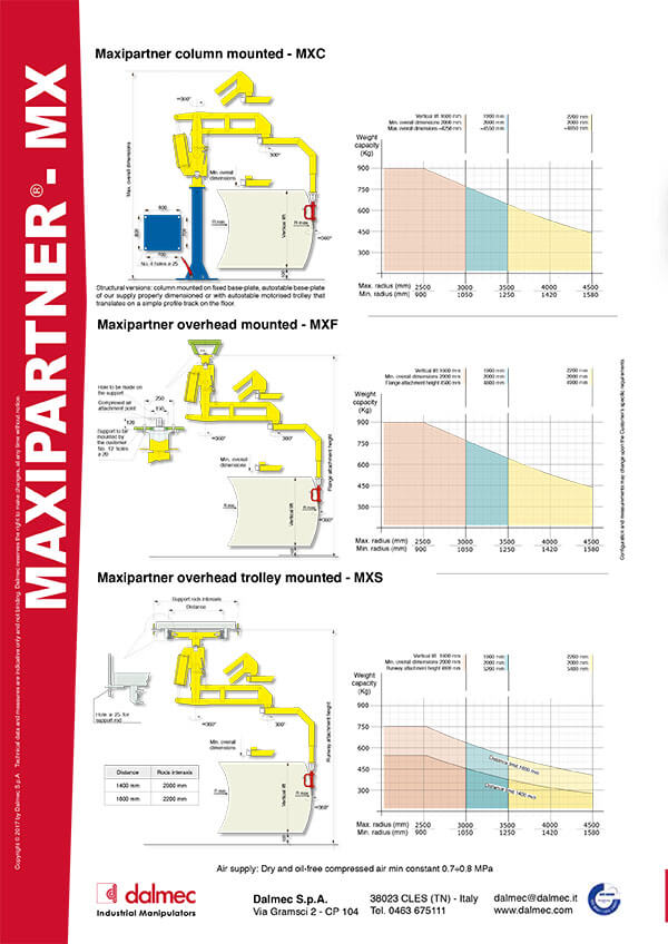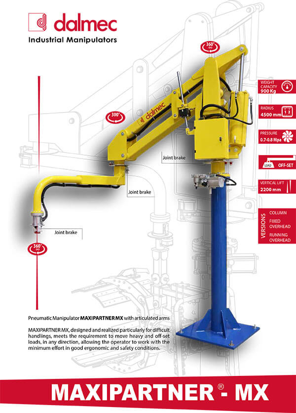 Featuring articulated arms and special gripping tools, is ideal for handling heavy (max 900 kg) and off-set loads in any direction. The MAXIPARTNER MX allows the operator work under safe and ergonomic conditions with minimal effort. Its slim and strong structure eliminates the “drifting” effect.
